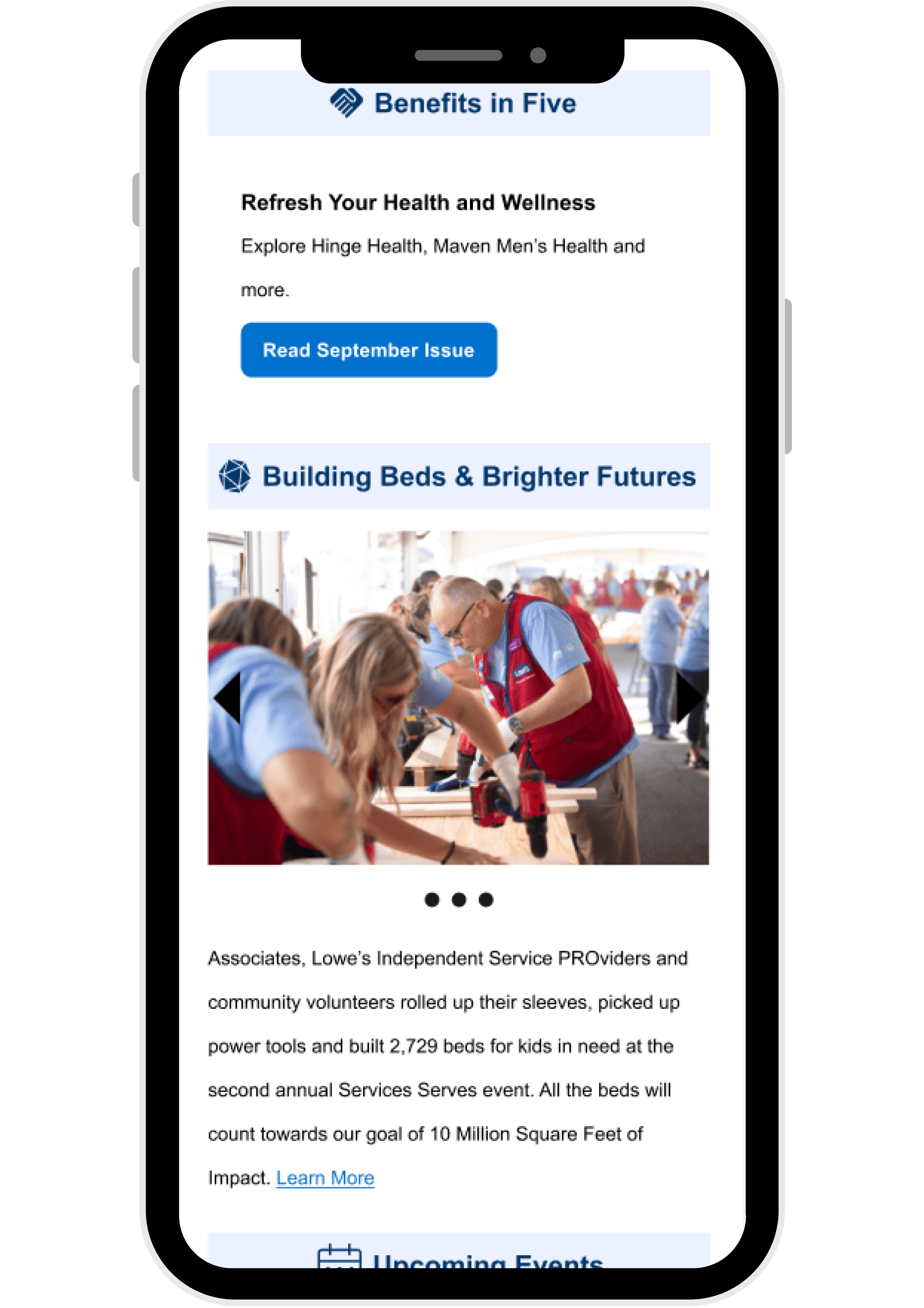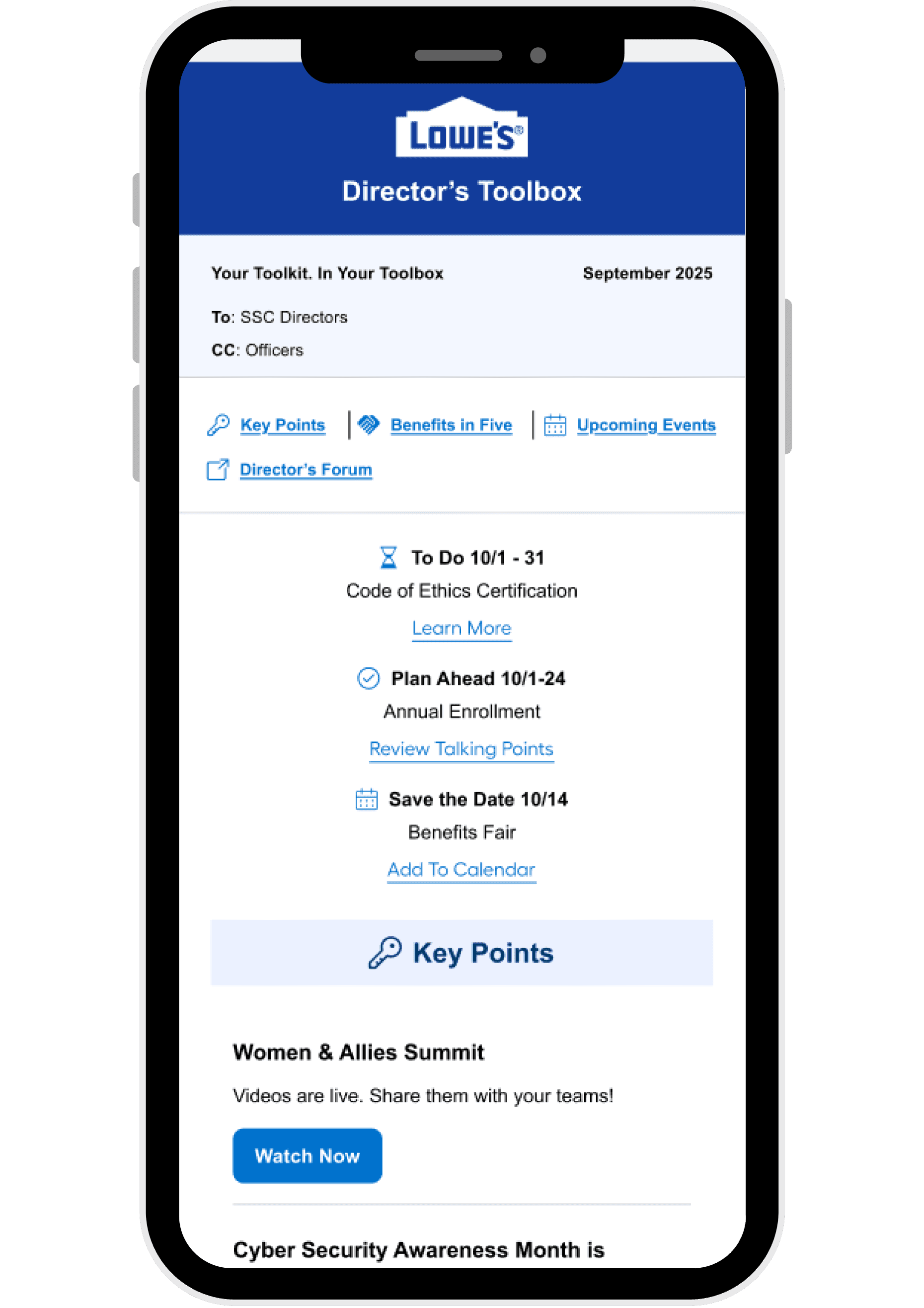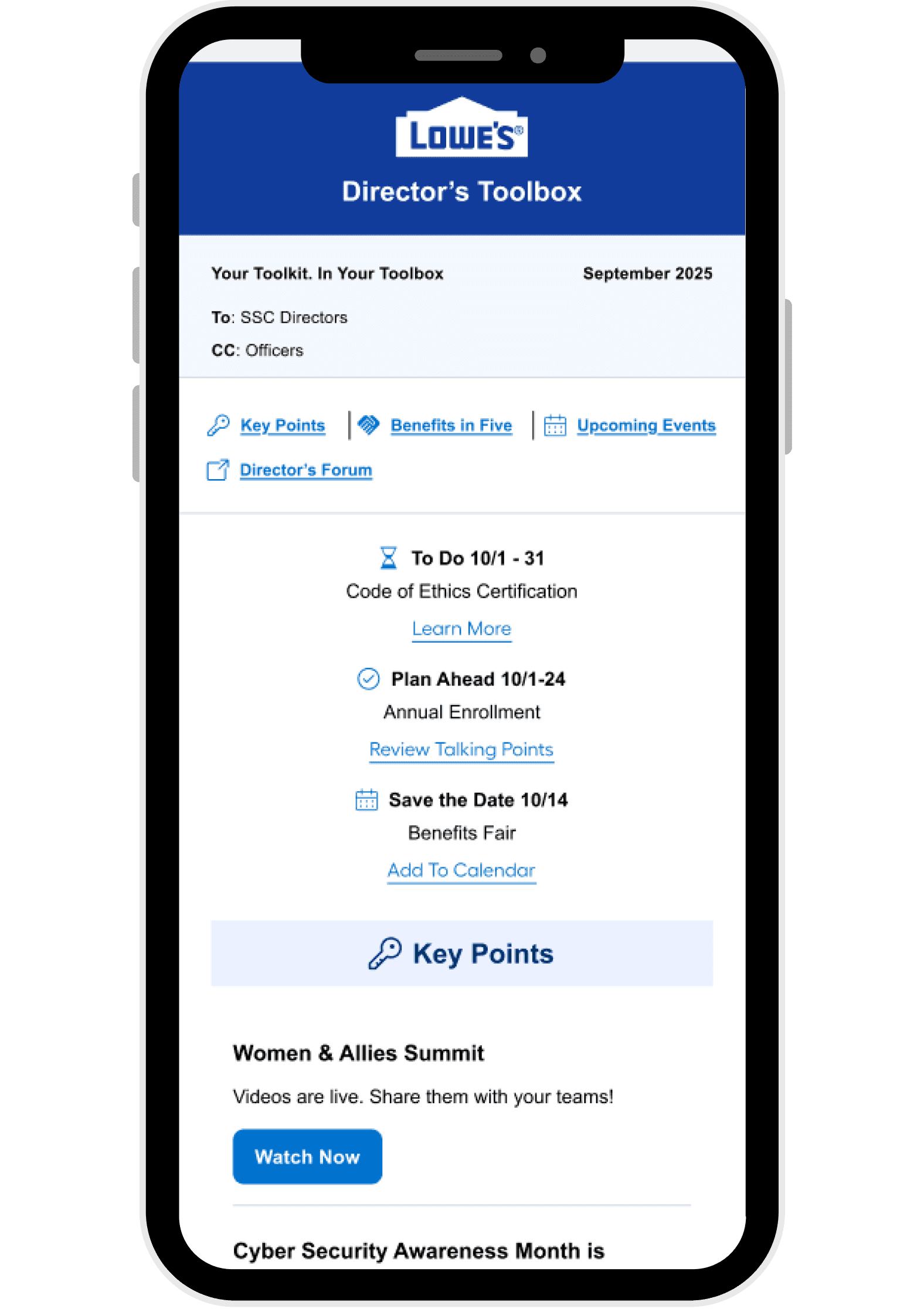 Director's Toolbox is a high visibility monthly email that provides Lowe's directors with a snapshot of events, priorities and updates for the upcoming month.