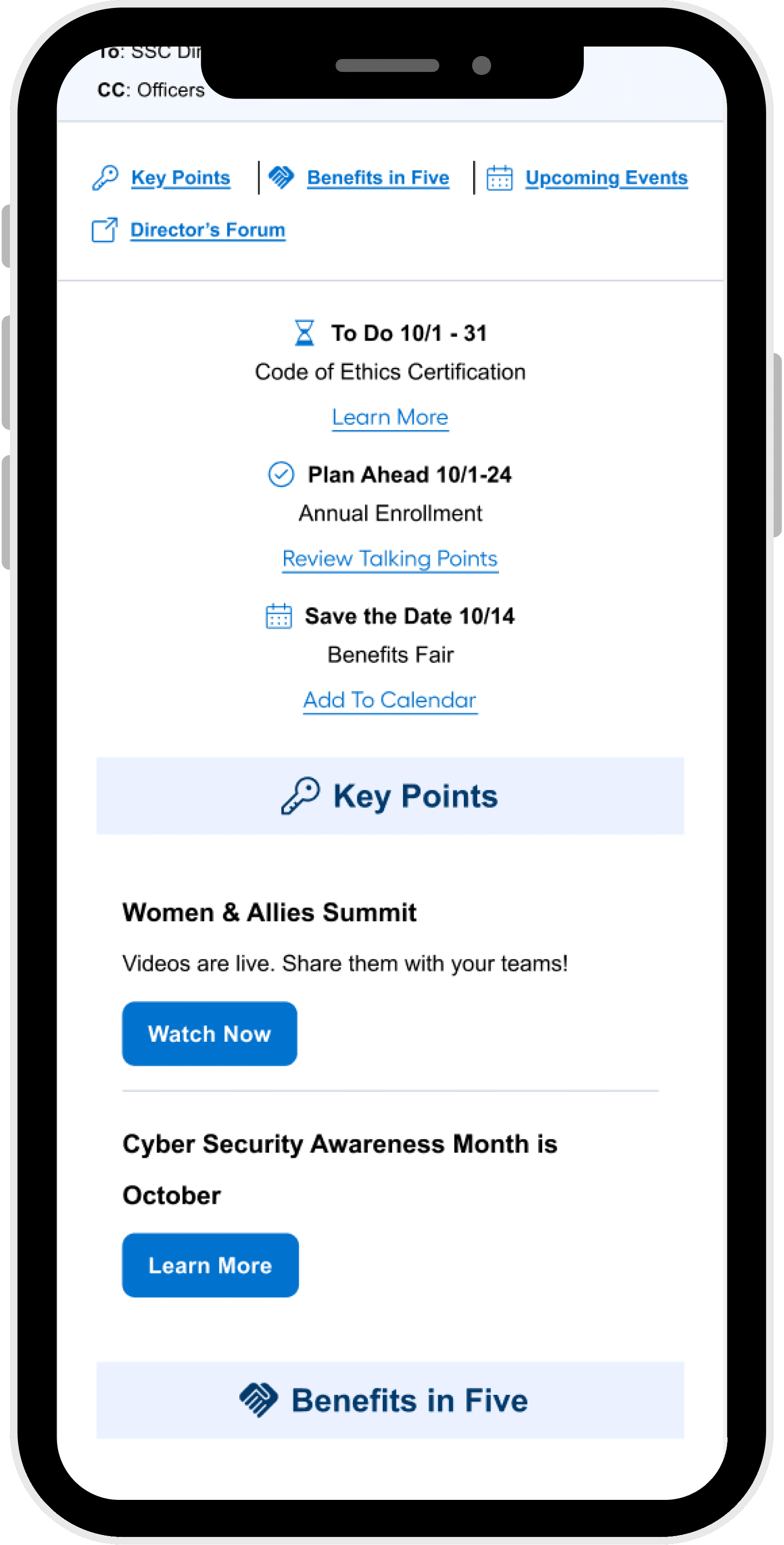 The Director’s Toolbox email is a monthly communication designed for Directors and Sr. Directors across all verticals. Originally intended to share key dates and updates, the format had become cluttered, repetitive, and difficult to navigate. Engagement was low, and the lack of hierarchy made it hard for leaders to quickly identify what mattered most.