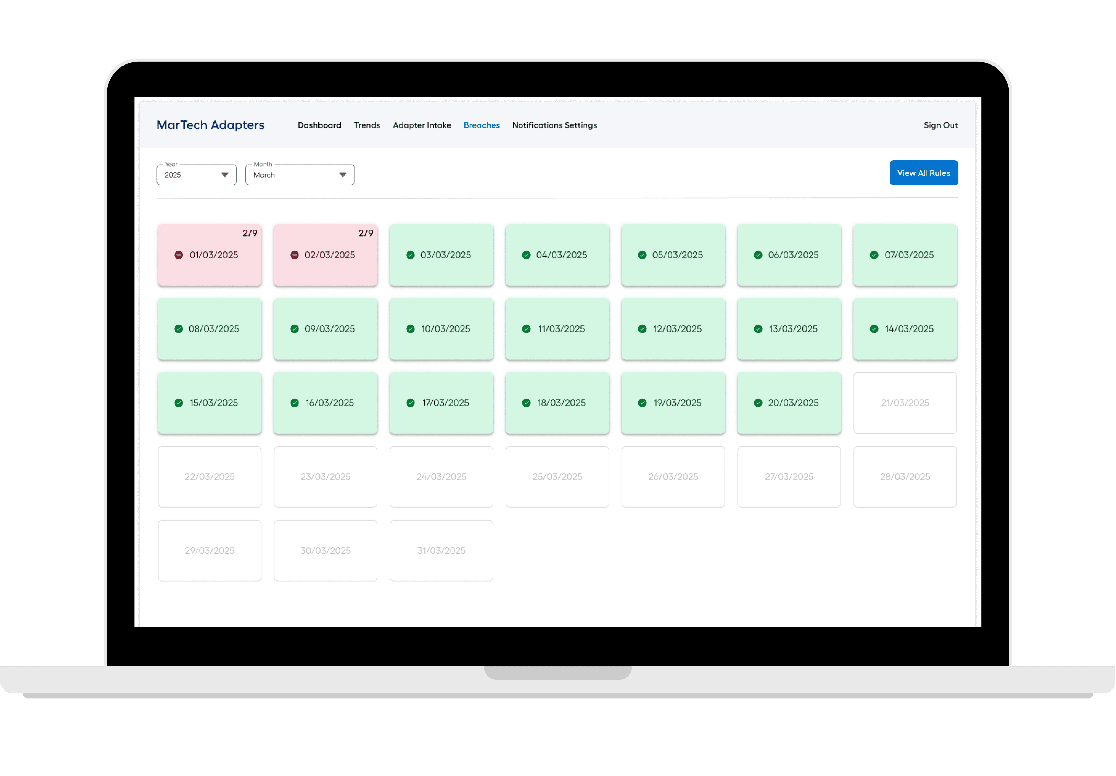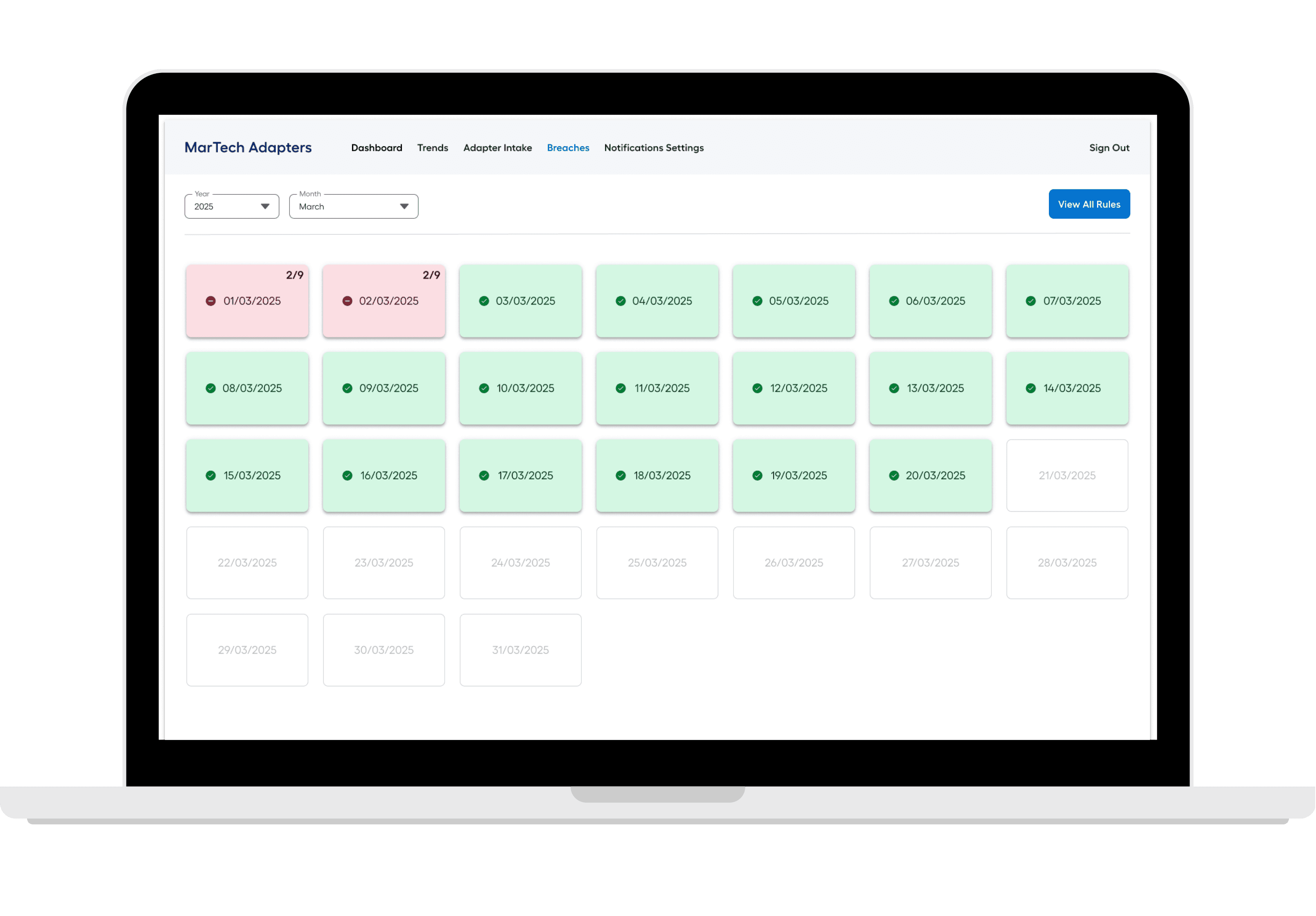 This screen introduces a calendar based interface for tracking Breaches. Color-coded dates help users distinguish between Breaches (red), approved (green), and upcoming (white).