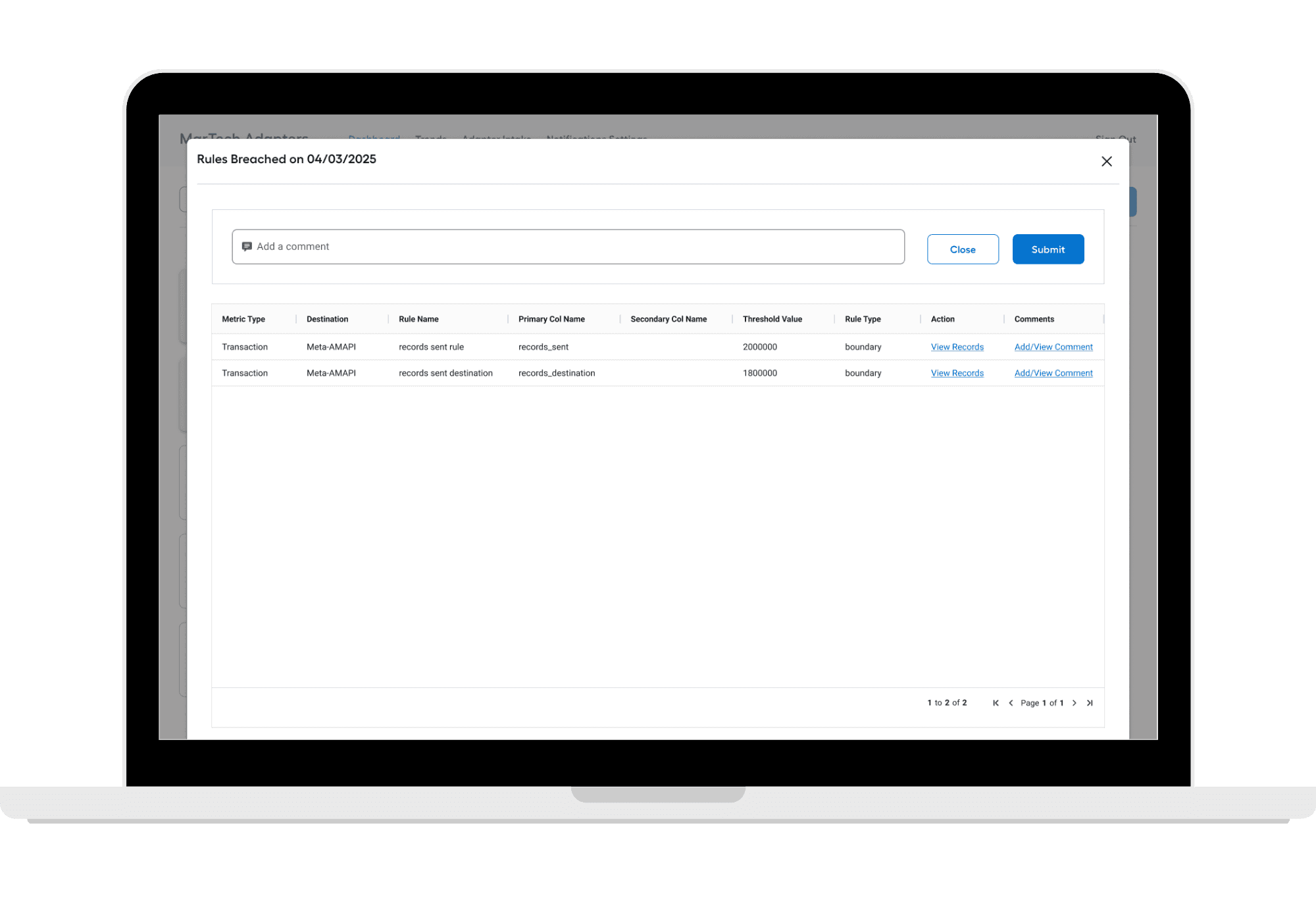 This view surfaces executed rules for a specific date, offering a structured table where you can add or view comments, and view records. The layout emphasizes operational clarity, enabling both technical users and compliance leads to monitor execution history and follow up on rule ownership or anomalies.