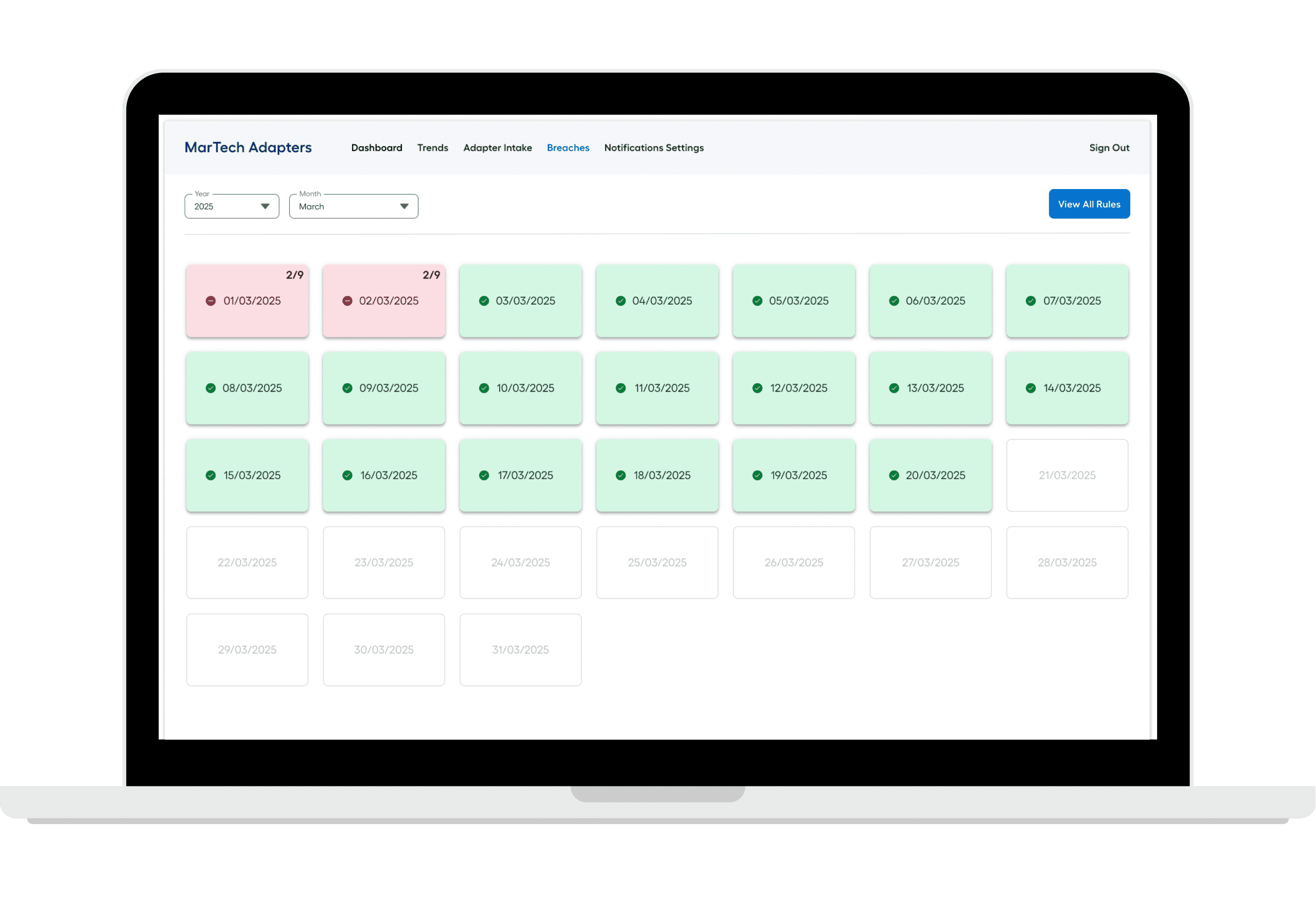 Marketing Adapters is an internal dashboard for monitoring campaign breaches, rules, and interactions.